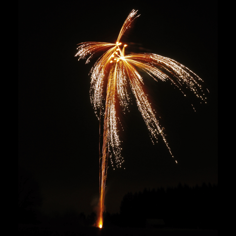25 Schuss Wasserfall-Batterie mit langziehenden weißgoldenen Blinksternen.