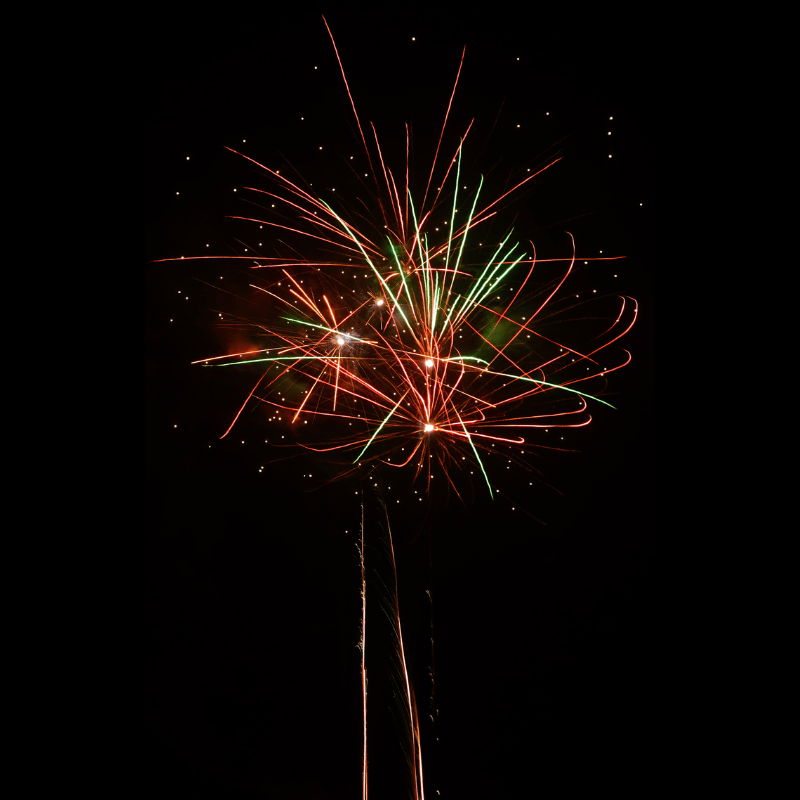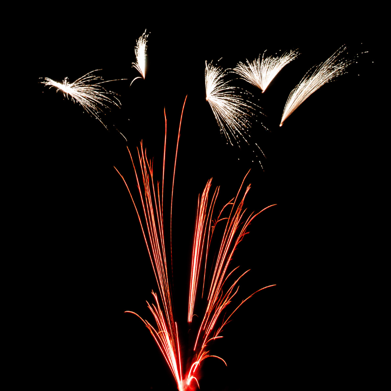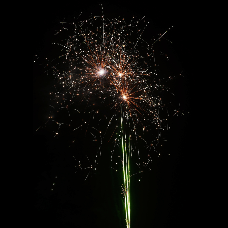 Phase 1: 50 Schuss mit Silberpalmen-, Blinksternen-, bunten Chrysanthemen- oder Crackling-Lanzen-Buketts.