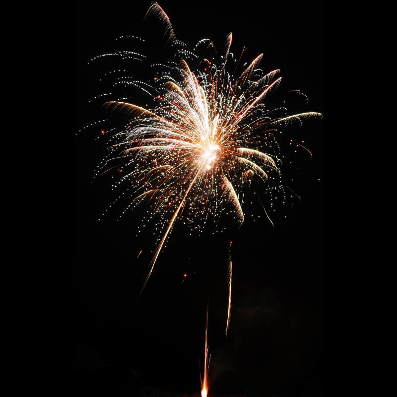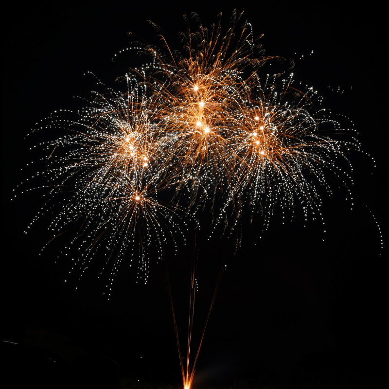 Phase 3: 36 Schuss-Finalbatterie, in schneller Abfolge geschossene, lautstark zerlegende Effekte mit verschiedenfarbigen Glitzer-Buketts gefolgt von einem Finale aus goldenen Chrysanthemen-Effekten.