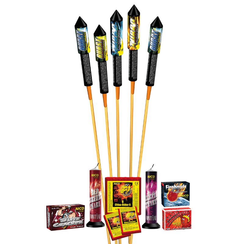 Feuerwerk-Sortiment im Klarsichtbeutel, Raketen und Knaller für die ganze Familie.